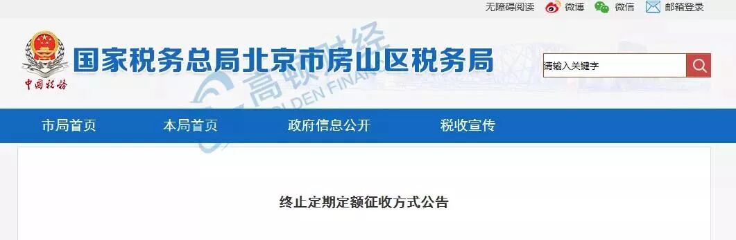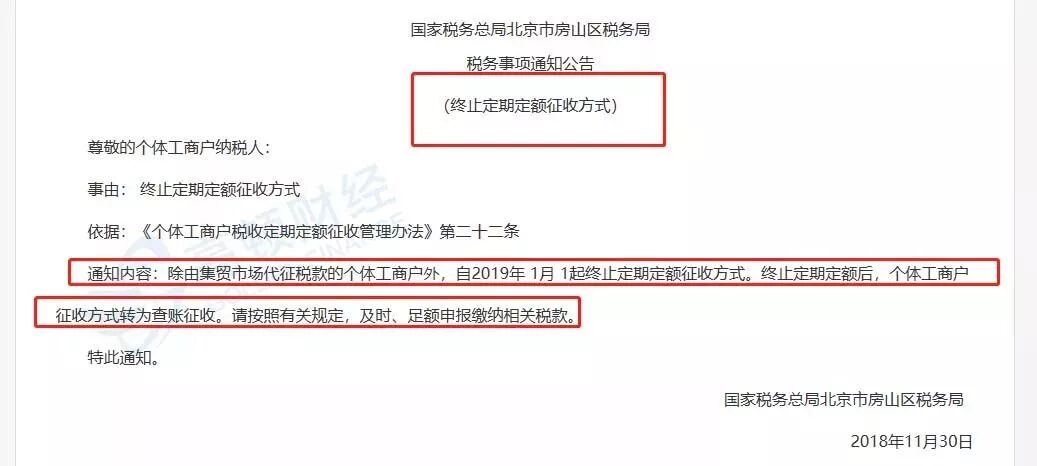 通知内容:除由集贸市场代征税款的个体工商户外,自2019年 1月 1起终止定期定额征收方式。终止定期定额后,个体工商户征收方式转为查账征收。请按照有关规定,及时、足额申报缴纳相关税款。
