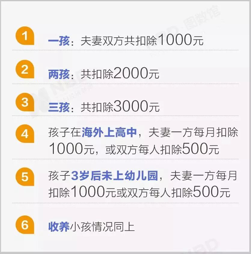 子女从满3周岁至教育结束,不论处在什么教育阶段,不论是在中国境内还是境外接受教育,均可按照每个子女/月扣除1000元,或由夫妻双方每人各扣除500元计算。