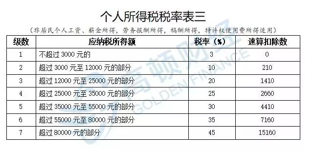 非居民个人的工资、薪金所得,以每月收入额减除费用五千元后的余额为应纳税所得额;劳务报酬所得、稿酬所得、特许权使用费所得,以每次收入额为应纳税所得额,适用按月换算后的非居民个人月度税率表(见附件2《个人所得税税率表三》)计算应纳税额。其中,劳务报酬所得、稿酬所得、特许权使用费所得以收入减除百分之二十的费用后的余额为收入额。稿酬所得的收入额减按百分之七十计算。